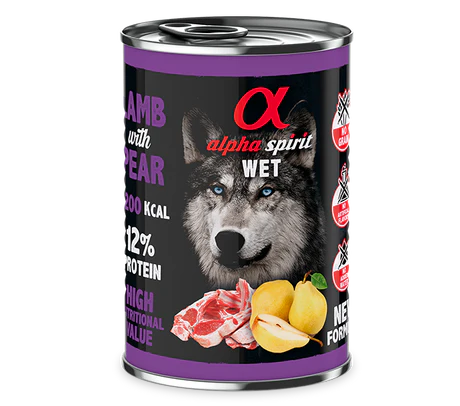 Cordero 93% (carne, hígado, pulmón), pera 4%, gelatina, pulpa remolacha molida, especias y minerales.